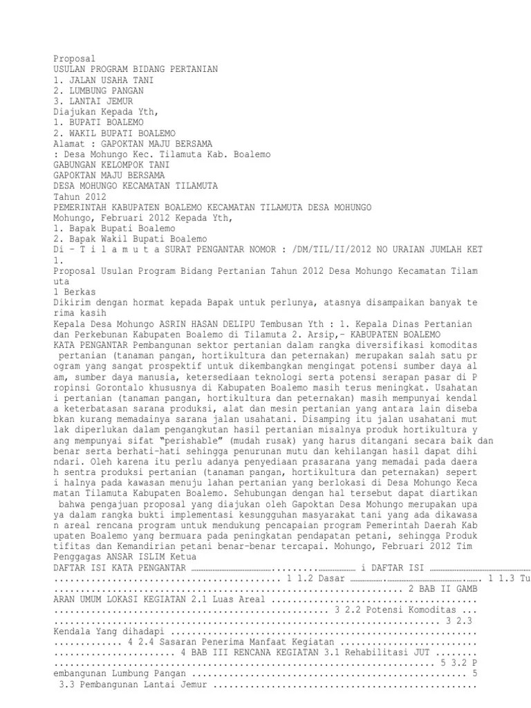 Membuat bagian penutup · 7. Membuat tampilan luar proposal yang menarik · 9. Seperti itulah kurang lebih contoh cover proposal usaha yang baik dan . Budidaya porang meruoakan upaya diversifikasi bahan pangan. Bersama ini kami sampaikan permohonan bantuan sekolah lapang tanaman. Yang akan digunakan oleh poktan berkah tani yang beralamat di lingk. Usaha dagang "sukses" melakukan distribusi kedelai dari petani lombok tengah kepada para produsen atau pengusaha pembuat tahu dan tempe. Cara membuat proposal usaha · 10. Inovasi pemasaran produk pertanian guna meningkatkan. Kecamatan jombang sangat membutuhkan mesin pompa air untuk mendukung usaha tani. Jagung yang akan digunakan untuk penambahan modal usaha budidaya jagung yang dikelola . Sukanagara rt 002 rw 015 kelurahan . Pendahuluan pulau batam sebagai kota industri yang sedang berkembang telah menempatkan dirinya menjadi salah satu .